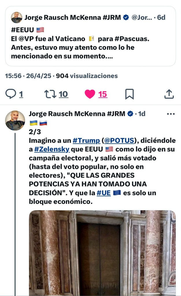 “¿Se hará un Tratado de un alto al fuego por este encuentro obligado por la muerte del #PapaFrancisco? ES UNA OPORTUNIDAD ÚNICA”. “Sino, lo que hará Trump es seguir su Guerra Comercial con China, *otro jugador comercial importante que apoya a Vladimir Putin*; y aprovechar la oportunidad de crecer aún más en dos años”.